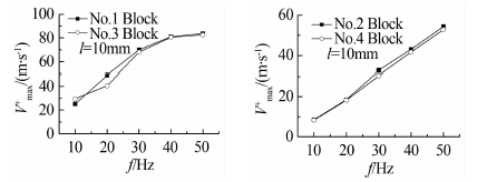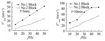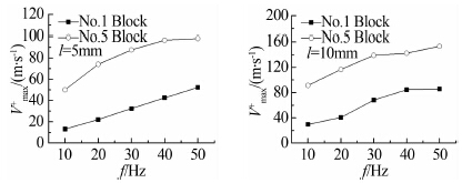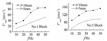 上图表明,振幅变化对型式射流堵块(狭缝型出口与排孔型出口)影响规律一致,V+max与振幅(l)呈正比关系,相同激励频率下,振幅越大,射流出口产生的极值速度越大。这可从能量守恒的观点出发进行解释:合成射流的能量源自激励器的机械能,在其它条件不变的情况下,随振幅增大射流器产生的机械能增大,合成射流动能增大,极值速度增加。