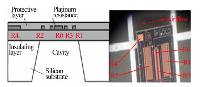 2 复合热膜敏感探头结构复合热膜敏感探头采用MEMS技术,将硅基片经氧化、溅射、光刻和腐蚀等工艺加工而成,结构组成包括硅基片、空腔、绝缘层、光刻铂电阻和保护层。绝缘层上采用溅射、光刻工艺生成了5个铂电阻,电阻上面覆盖保护层用于保护电阻,结构如图 1所示。其中R0为加热电阻,R3用于测量加热电阻的温度,R4用于测量气流温度,R1用于测量加热电阻R0下游气流温度,R2用于测量上游气流温度。电阻区域的面积为 2mm×2mm,薄铂膜电阻厚度为3μm,R0、R1、R2、R3与硅基隔离,可有效减少热惯性,具有较快的热响应速度。