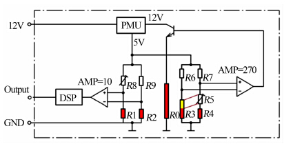 风速测量电路由测量电桥和信号调理电路组成。测量电桥由 R1、R2、R8、R9组成,常温时电桥各电阻阻值相同,R8用于调节桥路零点,R1用于测量加热电阻R0下游气流温度,R2用于测量上游气流温度;无气流时,R1=R2,桥路输出为0;有正向气流时,R1>R2,桥路输出正信号;有反向气流时,R1<R2,桥路输出负信号。信号调理电路用于电桥输出信号的放大、测量和DSP处理。该电路的特点是热传导和自然对流对测量电桥的影响基本没有,通过对元器件的合理选择和匹配,使得电路具有很好的零点稳定性,从而保障了低风速信号输出的稳定性。
