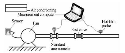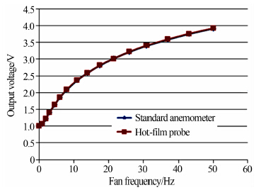 为了对复合热膜敏感探头的性能有所了解,采用吹风实验装置进行测试。该装置的基本结构如图 3所示。由风机产生一定速度的气流,流速的大小通过变频器调节;风机后面安装一台标准风速仪,该风速仪为丹麦的StreamLine热线风速仪,线性和重复性误差为±0.2%。