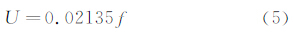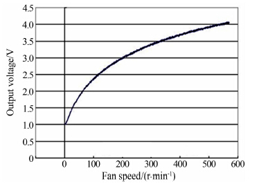 式中:f为风机转速,U为气流速度。图 4为R5=984Ω,热膜与气流温差为128℃时的吹风实验原始数据,横轴为风机转速,纵轴为复合热膜敏感探头输出信号。由图 4可以看出,输出信号和式(1)的相关性非常好;随着速度的增加,湍流强度也随着增加;在风速为2m/s时,风速仪约有2.2V的电压输出。