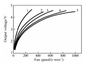 通过调整R 5的阻值可以改变复合热膜敏感探头的输出灵敏度,使得热膜敏感探头分别工作在5个不同的工作点,如表 3所示。不同工作点的测试结果如图 5所示,可以看出,热膜与气流温差越大,低流速下的灵敏度越高。当温差达到248℃时,在风速为2m/s时,热膜敏感探头约有3.5V的电压输出,灵敏度达到0.01m/s。