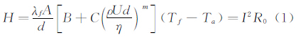 1 热膜探头工作原理热膜探头基于对流换热原理,将热膜探头置于被测气体中,热膜与被测气体之间将进行自然对流换热和强制对流换热。空气静止或流速很低时,空气自然对流传热达到热平衡;当气流流动时,气流与热膜传感器电阻的换热过程以强迫对流的形式为主[9]。换热量与很多因素有关,这些因素包括热膜和气体的温差、气体速度、气体温度、气体组分、气体压力等[10]。在低速风洞中,温差、气体温度、气体组分、气体压力等影响因素基本固定时,对流换热量就与流速呈一定的函数关系,利用这个原理即可进行气体的流速测量。热膜的热交换量和加热量关系如以下公式所示: