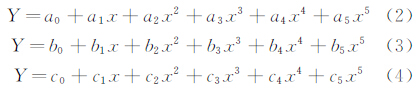 复合热膜敏感探头校准过程如下:首先通过风机产生一系列风速,读取标准风速仪对应输出的一系列电压值Yi;读取复合热膜探头对应输出的一系列电压值Xi,对Yi和Xi电压值分3段进行五阶多项式曲线拟合,获取3组复合热膜敏感探头的校准系数a0~a5,b0~b5 ,c0~c5,写入电路DSP中,曲线拟合公式如式(2)、(3)、(4)所示。