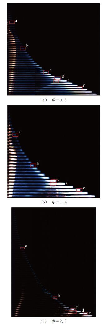 2.1 C-J爆震根据燃烧(爆震)理论,C-J爆震是Rankine-Hugoniot曲线上具有最小熵增的燃烧解[22, 25]。早在上世纪七十年代就已经有人成功实现了中尺度管道内汽油混合物的C-J爆震[34],以Lee的团队[25]为代表的很多研究者也都以预爆管的形式研究过小尺度的C-J爆震。但近年来,Wu等人[35, 36]率先在内径d=0.5,1,2和3 mm的光滑管内较清晰地拍摄到了C-J爆震波由静止起爆、传播的过程(见图 2),他们使用的是常温常压、化学恰当比的乙烯-氧气混合物。随后,何建男等人[37]拍摄并分析了6 mm管道内当量比Φ=0.8,1.4,2.2的C-J爆震现象(见图 3)。与预爆管起爆不同的是,静止起爆的火焰要经过DDT过程,伴随着速度变化,火焰也要经历指尖形、郁金香形、DDT转变和回爆(Retonation)、平面火焰等多种变化,其中包含了复杂的化学动力学机理。