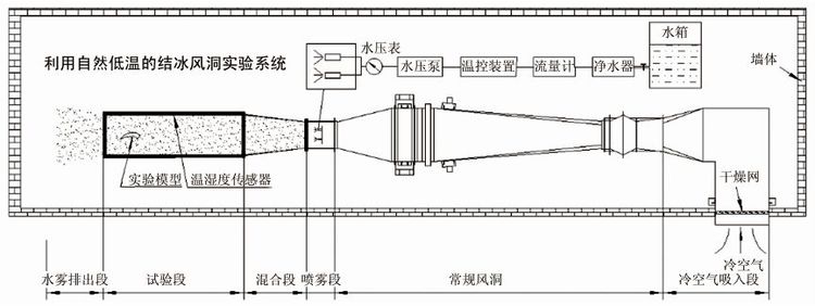 近年来,由于极寒天气的频繁出现使得风力机叶片结冰问题逐渐受到了广泛关注[1, 2, 3, 4, 5]。研究叶片的结冰机理和防除冰技术的主要手段之一就是利用结冰风洞来实际测试。结冰风洞是一种模拟在寒冷环境中过冷水滴在一定风速带动下撞击到物体表面结冰的实验设备。结冰风洞多用于航天航空领域,最主要的就是机翼结冰,还有发动机、传感器及相关零部件结冰。目前世界上能够进行结冰实验的风洞有20余座,主要分布在美国、加拿大、法国、英国、意大利和俄罗斯等国家。其中具有代表性的是美国NASA 刘易斯研究中心的闭式结冰风洞,意大利的IWI结冰风洞及中国空气动力研究与发展中心于2014年完成的3m×2m 大型冰风洞[6, 7, 8]。然而,这些风洞规模大、耗能多、成本高,中、小科研院所和高校很难建设和使用。因此,研制结构简单,能耗低廉的结冰风洞成为结冰研究的一个重要方向。风力机工作的环境就是在地表,属于在自然环境下的结冰问题,而不是像飞机属于高空特殊环境下的结冰。因此,研究风力机叶片结冰问题,在某种意义上来说并不需要如此高精度、高成本的结冰风洞,接近自然条件的低温环境风洞更适合。另外,如果利用自然低温为结冰风洞提供冷源的话,既省去了复杂的人工制冷设备,降低设备成本费用,又省去了人工制冷设备的能耗,降低设备使用费用。通过自然低温为冰风洞制冷在国际上已有先例,加拿大在1942年就建造了一座开式的简易冰风洞,利用冬季寒冷的气候自然制冷;位于明尼苏达州首府的Fluidyne Engineering Corp利用冬季寒冷环境为冰风洞制冷,所研发的开环式冰风洞主要用于发动机防冰研究[9]。在国内还没有利用自然低温进行制冷的冰风洞。