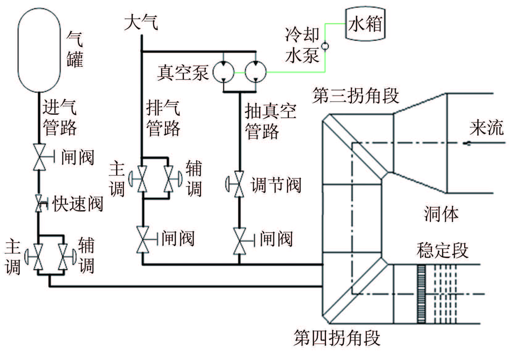 0.6m×0.6m连续式跨声速风洞(以下简称0.6m风洞)为国内首座具备负压实验能力的连续式跨声速风洞,试验马赫数范围为0.2~1.6,压力范围为20~250kPa(绝对压力),具有3个试验段,该风洞通过阀门控制系统实现常压、增压和降压运行,其中增压、常压运行通过调节进排气系统实现,降压运行通过调节抽真空系统实现。