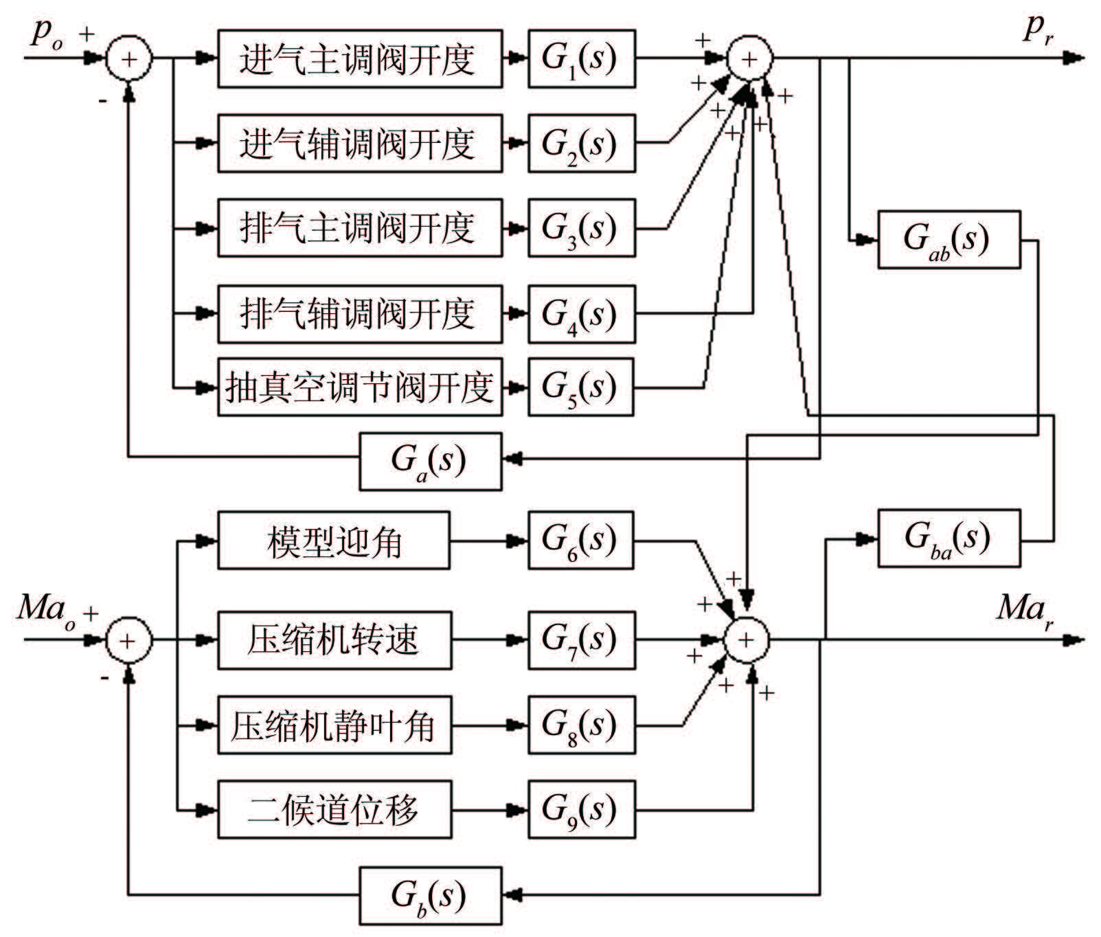 其中,G1(s)至G9(s)分别为每种控制量的传递函数,Gab(s)为总压对马赫数的影响函数,Gba(s)为马赫数对总压的影响函数,Ga(s)为总压控制传递函数,Gb(s)为马赫数控制传递函数。