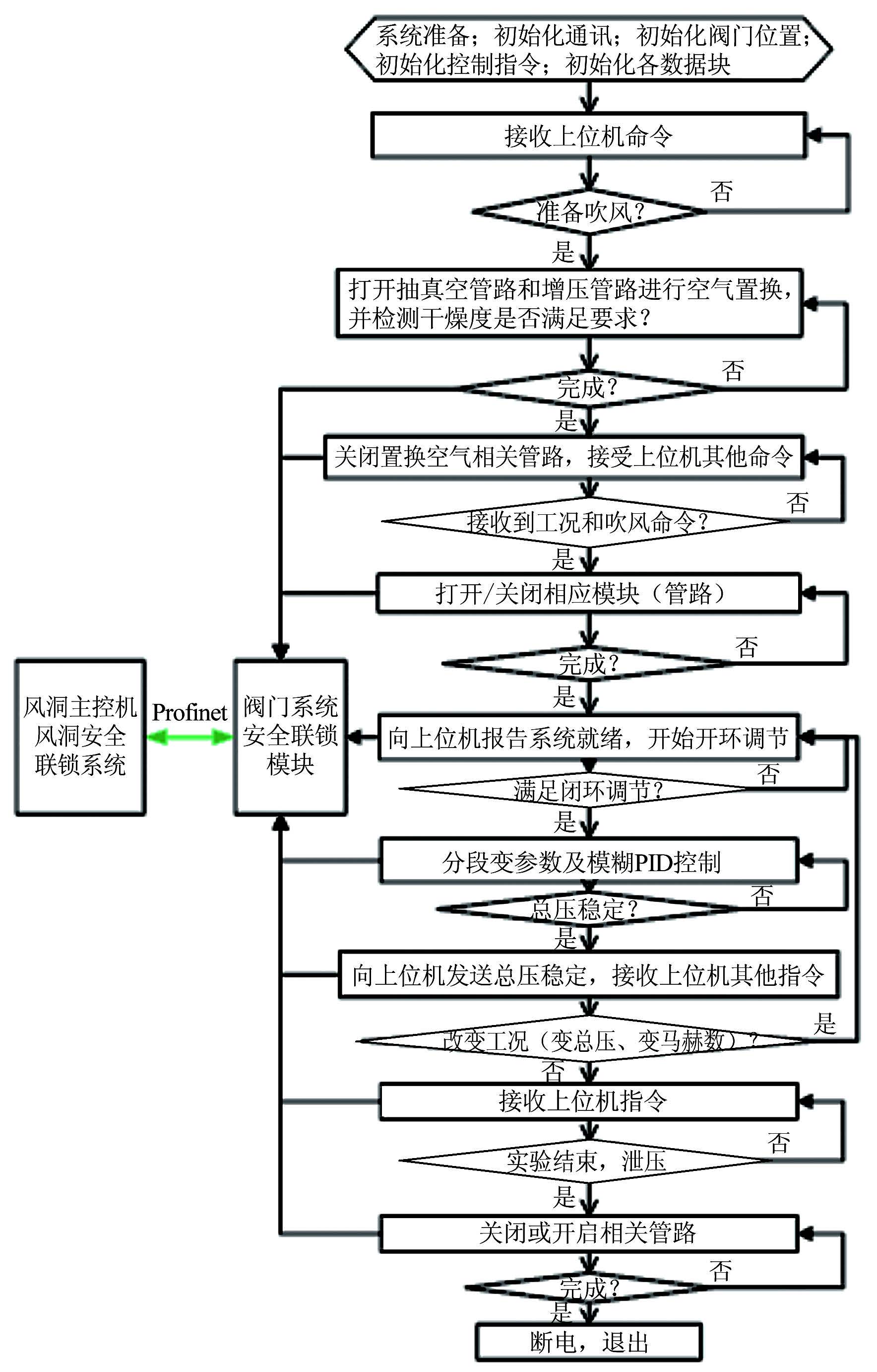 程序设计时首先基于模块化编程方法,将阀门和泵进行组合以实现不同压力工况控制,风洞运行时,根据工况命令调用不同的模块,以满足多种工况下阀门开关组合的控制逻辑需求,并通过压力控制模块实现闭环控制,压力闭环由阀门系统PLC 315实现,风洞主控系统和阀门控制系统通过Profinet工业以太网进行通信,阀门控制系统软件流程见图 4。