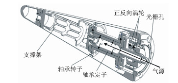 1.3 基于气浮轴承的自由滚转试验技术基于气浮轴承的自由滚转试验技术的基本原理和试验方法与弹性铰自由振动试验技术不同,该技术能够对小不对称滚转静力矩进行测量的同时得到滚转阻尼导数[10-12]。其核心部件如图 3所示,其工作原理和试验方法在文献[10-11]中均有详细描述,这里简要介绍如下: