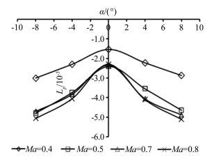 首先以某制导炸弹外形模型A为例进行滚转阻尼导数测量试验技术的选择。该模型特点有:翼较大,滚转阻尼导数较大,根据前期CFD计算和工程估算,量级约为10-1;模型与静态试验共用,转动惯量较大;根据其飞行条件、缩比和减缩频率要求计算得到所需风洞试验滚转方向振动频率约13.5Hz。针对此模型的这些特点,如表 1所示,如果采用1.6mm厚度一体式弹性铰进行试验,试验频率与所需频率接近(9.1Hz),L0(-3.24×10-3)也比Lp小了2个量级,足以满足试验需求。表 4显示了风洞试验部分状态点的试验结果,可以看到,Lp量级与前期估算一致,风洞试验结果可信。