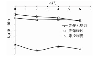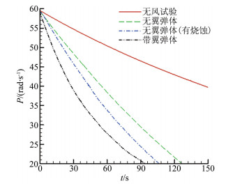 图 7显示了无风情况下和吹风情况下不同试验弹头的模型转速变化曲线,可以看到试验曲线能够清晰反映出模型烧蚀和控制翼面产生的模型转速变化,有利于数据的分析和辨识,得到其中的滚转阻尼导数变化。数据辨识后的试验结果如图 8所示,很小的Lp变化,特别是弹头烧蚀所产生的变化能够得到准确测量,得益于基于气浮轴承的自由滚转试验技术的低机械阻尼特性。