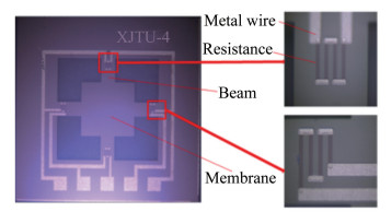 加工完成的传感器芯片如图 4所示, 整体芯片尺寸为2.5mm×2.5mm×0.25mm。
