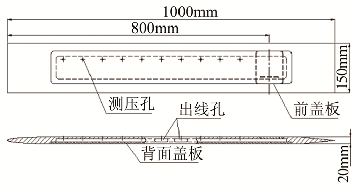 本试验平板模型选用的材料为抗锈铝,其前缘为长轴短轴比10:1的半椭圆,后缘为长宽比10:1的楔形,中段为平行段。如图 1所示(其中尺寸单位为mm)。模型整体长(L)×宽(W)×厚(H)=1000mm×150mm×20mm。其中传感器阵列安装位置中心距前缘800mm,平板模型前缘和后缘部分分别抛光以平稳过渡到平行段,从而确保模型周围的流动平顺。