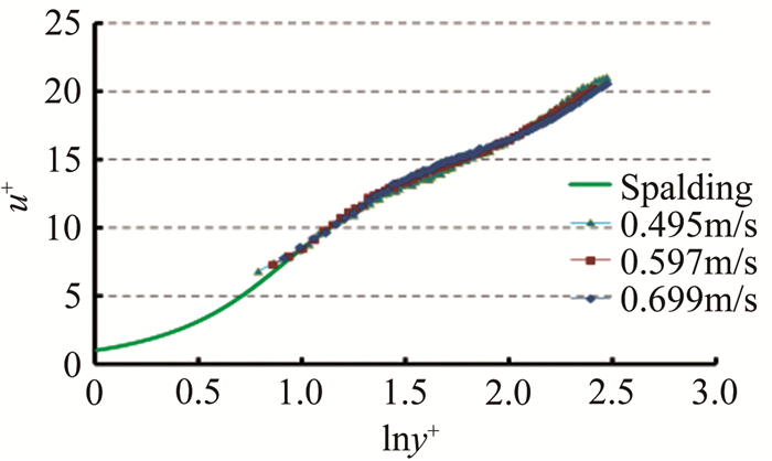 高流速的速度剖面与Spalding经验公式[15]进行对比,如图 10所示。