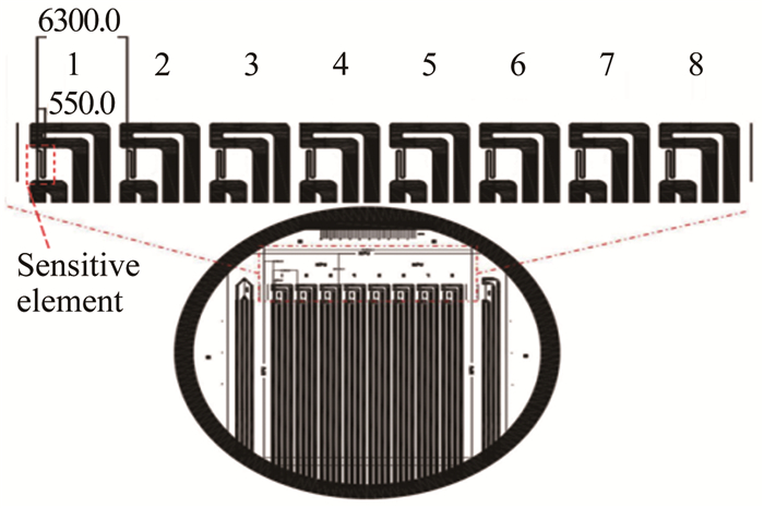 水下MEMS壁面剪应力传感器阵列由8个彼此间距为6.3mm的热膜式MEMS敏感单元组成,沿流向成行排列并集成在整块柔性基板上,如图 2所示(其中尺寸单位为μm)。其整体尺寸长为70mm,宽50mm,总厚度为75μm。各单元尺寸长为3mm,宽0.55mm。