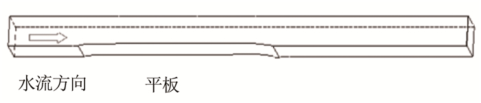 在实验之前还对水下平板流动进行了CFD仿真模拟,考虑到节省计算资源和绕流平板流场的对称性,本文仅对平板绕流流场的一半进行数值计算,计算域宽度为实验段宽度的一半,计算域长度和高度与实验段保持一致。物理模型和网格与边界条件设置如图 4和5所示,以v=0.7m/s为例,平板上的壁面剪应力分布如图 6所示。从图 6可以看出,平板壁面剪应力由前端往后不断降低。在平板的去流段,截面沿流动方向持续变大,造成流动与边界分离。相应地,引起平板去流段壁面剪应力发生不规则变化。
