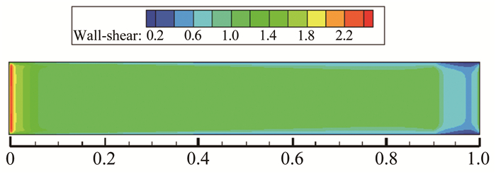 | 图 6 v=0.7m/s平板壁面剪应力云图 Fig.6 Contours of wall shear stress distribution(v=0.7m/s) |
