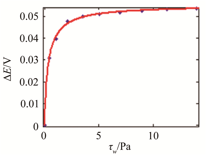 式中:E0是水速为0或者没有壁面剪应力输入时的电压值,ΔE是有壁面剪应力作用在传感器上时的电压差值,E、E0、τw均为试验测得,A、B、n是标定系数,在相同温度下为常值。
