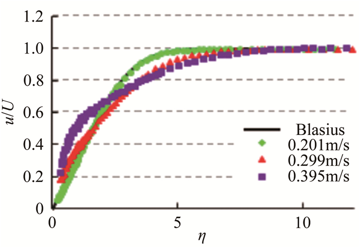 将LDV测得低流速下的速度剖面测量结果与Blausis解[14]进行比较,如图 9所示。速度剖面的横坐标采用无量纲长度参数