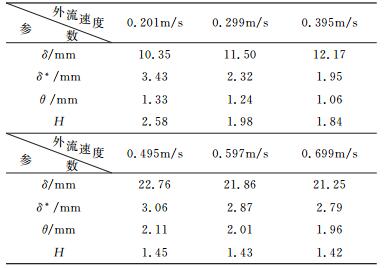 由流体力学相关知识可知,当流体流经固体壁面时,会在壁面附近形成速度梯度明显的流动薄层即边界层。本文根据测得的速度剖面分别计算了边界层厚度、形状因子等流动参数。边界层厚度通常是指从壁面开始到沿壁面切向流向速度达到自由来流速度99%的位置高度。边界层动量厚度和边界层位移厚度分别从边界层动量损失情况和质量损失情况对边界层进行了描述。在有压力变化的湍流边界层中,通常用形状因子H=δ*/θ来对速度剖面进行描述。在本次平板试验中,由LDV测得的不同来流速度下的基本流动参数[16]如表 3所示。