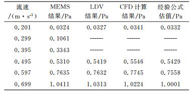 将MEMS直接测量结果与LDV间接式测量结果、CFD计算结果以及经验公式计算结果进行对比,比较结果如表 4和图 11所示(以MEMS传感器阵列的5号敏感单元为代表进行分析)。