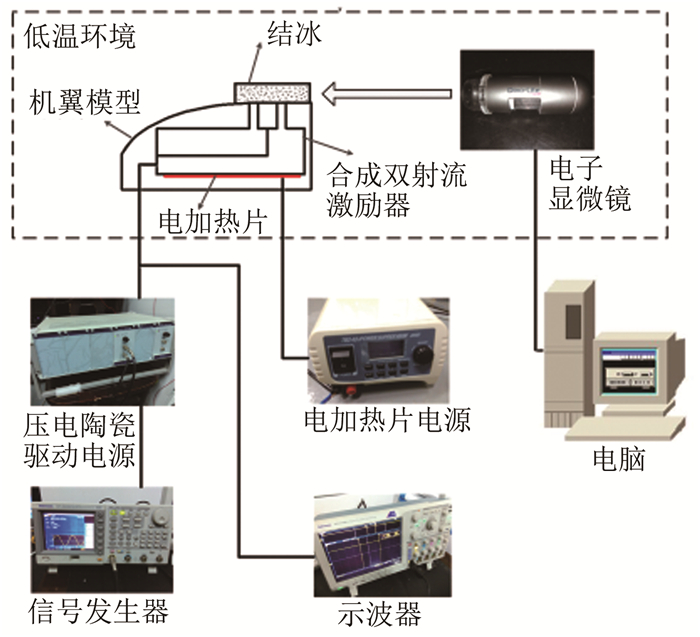 1 实验设备及实验过程 1.1 实验设备如图 1所示,合成热射流机翼除冰系统由地面低温环境下的机翼模型、合成双射流激励器系统和观测系统组成。