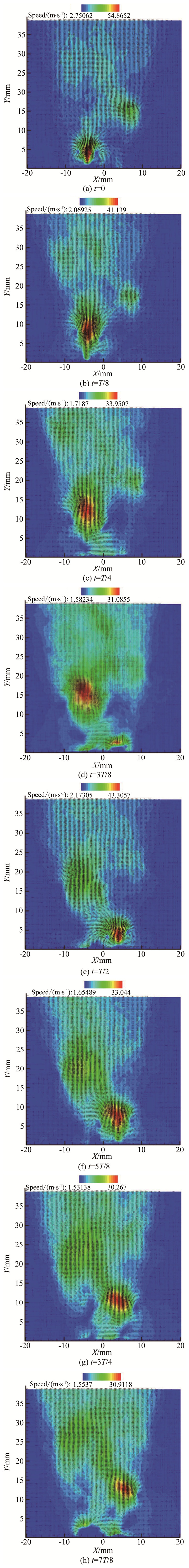 为了了解合成双射流激励器的工作特性,在进行除冰实验之前对激励器的流场特性进行了PIV实验测量,图 3给出激励器在除冰工作条件下1个周期内出口附近的流场图。