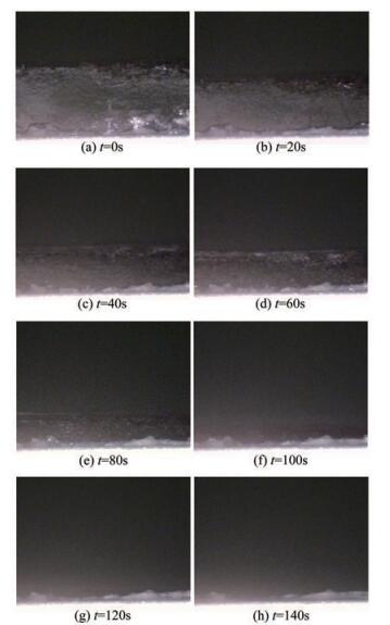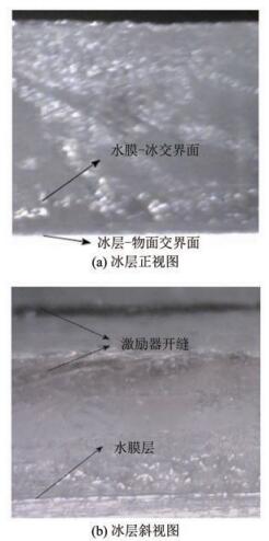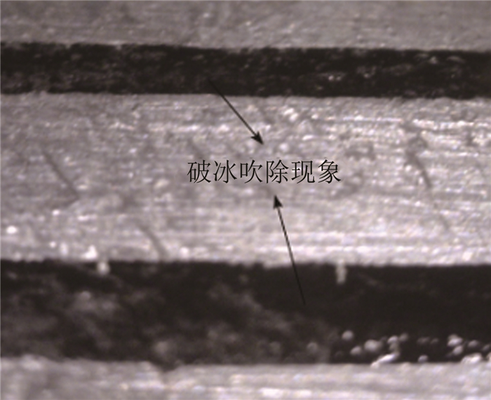 为了进一步研究除冰过程中的融冰机理,采取了2个角度进行了拍摄:第1个角度采用更近距离、更高放大倍数观察冰层,如图 8(a)所示;第2个角度是在冰层斜上方拍摄,如图 8(b)所示。
