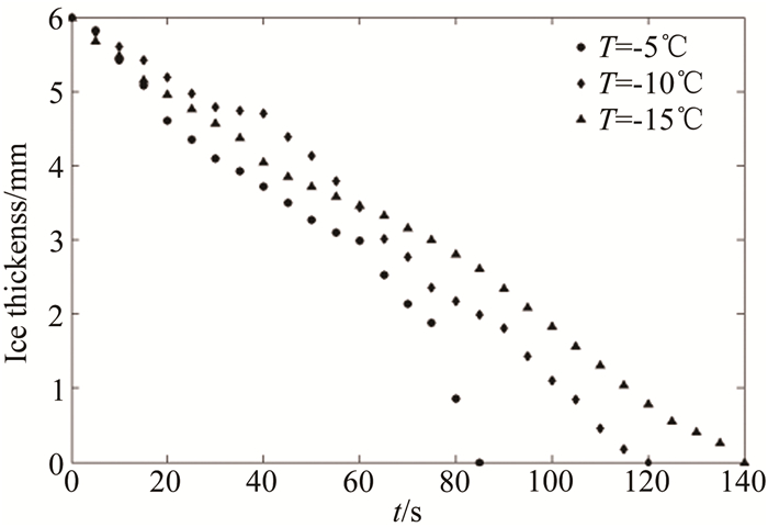 2.1 3种环境温度下热射流除冰如图 5所示,当环境温度为-15℃时,6mm厚度的冰层在合成双射流的加热和机翼表面的升温双重作用下融化,靠近机翼模型表面的冰层先融化,当冰层融化到足够薄时,合成双射流冲破冰层,最终在实验开始140s后完全融化。