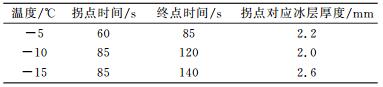 由图 6可知,在T=-5℃时,除冰时间为85s,T=-10℃时,除冰时间为120s,T=-15℃时,除冰时间为140s,故温度越低,除冰速度越慢,这说明低温环境增加了机翼除冰的难度。同时,排除实验误差的干扰,对数据进行拟合,随着时间增加,3种温度下的除冰速率都呈现“两段式”的变化规律,即先慢后快的规律,它们的除冰速率拐点位置如表 1所示。