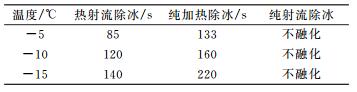 另外为研究合成射流和加热各自对除冰的作用,分析除冰过程中的能量传递,分别进行了合成射流单独除冰、单独加热除冰的实验,除冰的时间对比如表 2所示。