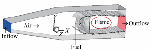 Due to experimental limitations, the experimental condition is a reduced pressure model state. As shown in Fig. 1, the air flow rate from "Inflow" to the combustor is 0.44kg/s, and the temperature and the pressure are 861K and 0.55MPa respectively. The flow rate of the liquid kerosene from "Fuel" into the combustor is 0.0115kg/s, and the temperature is 300K. The calculated side wall boundary condition is also wall, which is the same with the experiment. Moreover, k-ε two-equation model is used as the turbulent model in simulation, and detailed chemical reaction mechanism of the kerosene is used for kinetics. Then 203 species are included in the chemical reaction mechanism. In this paper, the boundary conditions of experimental measurements and numerical simulation are shown in Table 1.
