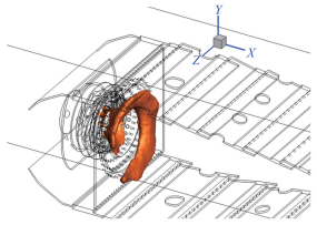 3.2 Numerical results and analysisFig. 9 shows that the iso-surface of liquid particle axial velocity is 5m/s (red surface) and -1m/s (blue surface) respectively. Because the distribution of liquid particles is not continuous, the contour distribution of liquid particles velocity is also discontinuous. As a result of the action of the swirler, the liquid phase particles are attached to the combustor wall of the primary zone of the combustor (the red iso-surface in Fig. 9 indicates that the axial velocity is positive). Under the action of air in recirculation zone, some of the liquid particles flow back(the blue iso-surface in Fig. 9 represents that the axial velocity is negative).