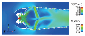 Two legends are given in Fig. 11~12 of the flow field parameters contour distribution. One is the liquid particle diameter, and the other is gas phase flow field parameters, including velocity and mixture fraction.