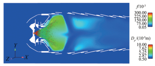 | Fig.12 Mixture fraction and diameter of fuel droplets in combustor 图 12 燃烧室混合分数及燃油液滴直径分布 |