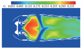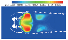 | Fig.15 Contour of mass fraction of CO in combustor 图 15 燃烧室一氧化碳云图 |