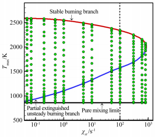| Fig.7 S curve of the maximum temperature with the variation of the stoichiometric scalar dissipation rate 图 7 最大温度随当量标量耗散率变化的S型曲线 |