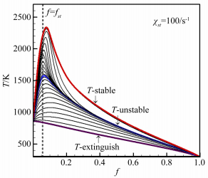 Fig. 8 is the temperature T distribution in the mixture fraction space when the stoichiometric scalar dissipation rate is 100s-1. Each line corresponds to a transient laminar flamelet. The black line at bottom is referred to "T-extinguish", which are extinguished flamelets. The red upper line is referred to "T-stable", which are stable burning flamelets. The middle blue line is referred to "T-unstable", which are partial extinguished unsteady burning flamelets. And all the flamelets between "T-extinguish" and "T-stable" are the laminar unsteady flamelets in transient state.