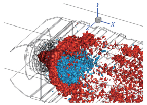| Fig.9 Iso-surface of liquid particle axis velocity is 5m/s (red surface) and -1m/s (blue surface) respectively 图 9 燃料质量分数为0.015的等值面图 |