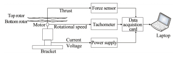 试验装置示意如图 1所示,传感器、转速计以及电表测量值经数据采集卡传输到电脑中,以便计算和整理出不同间距下共轴双旋翼的拉力、转速和功率,这3个物理量可用来衡量旋翼系统的气动特性。