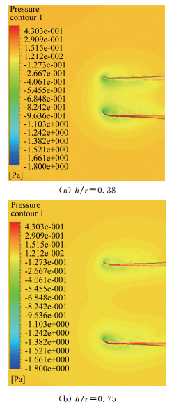 旋翼桨尖压强分布如图 10所示,不同间距比下的旋翼桨尖处均存在负压区域,当转速较高时桨尖附近会产生低压,从而产生吸附作用,使得上下旋翼桨尖处吸附的桨尖涡脱落并相互诱导,最终影响流场分布。此外,对比旋翼间压力分布,发现间距比为0.38的旋翼间压力较小,与旋翼外部空气域的压力差值较大,表明小间距下的共轴双旋翼与周围空气的相互作用更强烈。