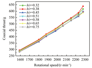 | 图 4 典型转速下共轴拉力随间距比变化 Fig.4 Coaxial thrust vs. rotor spacing at typical rotational speed |