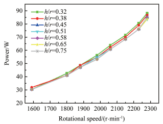 在保持较大拉力的同时,功率损耗是衡量系统气动性能的另外一个重要指标,各间距功耗随转速变化如图 3所示,对比转速1600~2300r/min内旋翼消耗的功率,间距比0.38均小于间距比0.32,其他间距比下的功率消耗大体呈现出一致的趋势。结合图 2~3,仅当间距比为0.38时,该旋翼系统具有最大拉力的同时拥有较低功耗。