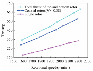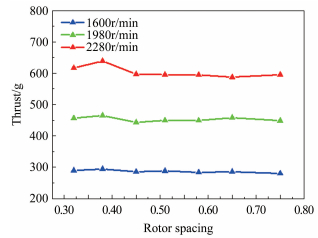 | 图 2 不同间距下共轴双旋翼拉力 Fig.2 Thrust of a coaxial rotor with different spacing |