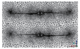 3 数值模拟 3.1 计算模型及边界条件设置本文以ANSYS为仿真平台建立微型共轴双旋翼的有限元模型,主要对旋翼的旋转域和外部空气域进行几何建模、网格划分以及湍流模型和边界条件的设置。为提高流场模拟精度,在流场物理量梯度较大的区域进行网格细化,控制网格总体数目并保证旋翼模型周围的网格密度,整个计算域的网格总数为371585。旋翼及流场的网格划分如图 7所示。