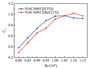 为了验证数值模拟方法的有效性,本文选取标准翼型NACA0012对比文献[15]中的仿真结果,得到拉力系数在低雷诺数环境下的变化规律,计算结果对比如图 8所示。从图中可以看出,在桨尖雷诺数范围为0.8×105~1.0×105内,本文的计算结果虽然较文献略高,但是2种计算结果整体吻合较好,证实了本文的数值模拟方法是可行的。