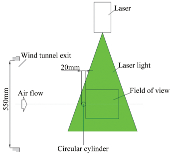 对圆柱绕流尾迹的研究,有理论分析、实验研究和数值模拟3种方法。由于理论简化受限、实验耗费较大,现阶段的研究以数值模拟为主、实验研究和理论分析为辅。热线风速仪[3-4](Hot-Wire Anemometer, HWA)和粒子图像测速[5-6](Particle Image Velocimetry, PIV)是常用于圆柱绕流研究的实验设备。热线风速仪价格便宜、频率响应高(达20kHz以上),但只能进行单点测量且与流场直接接触,会对绕流尾迹产生显著影响;另一方面,PIV能够非接触地获取较大范围内整个流场的瞬时速度信息。因此,PIV是对圆柱绕流尾迹进行定性的流场显示和定量的流场测量与分析的理想工具。
