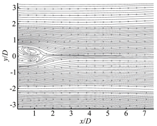 2 实验结果及分析 2.1 平均流场特性分析图 2给出了根据PIV测量结果计算得到的平均速度场的流线图,从图中可以看出,在圆柱壁面正后方约1.4D的区域内存在2个与圆柱半径同尺度的反向旋转的旋涡,旋涡中心位于0.8D的位置附近,圆柱上下两侧交替脱落的旋涡进入尾流场后形成了低速回流区。