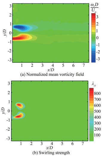 | 图 3 平均速度场的归一化涡量图和旋转强度图 Fig.3 Normalized mean vorticity field and swirling strength |